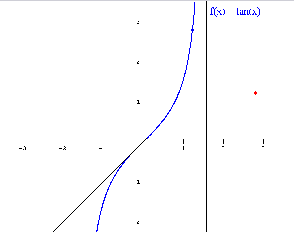 De nuevo le pedimos a Cabrí que nos grafique la función inversa de y = tan(x), manteniendo el punto rojo simétrico al punto azul, obteniendo en este trazo, la gráfica de la función arctan(x).