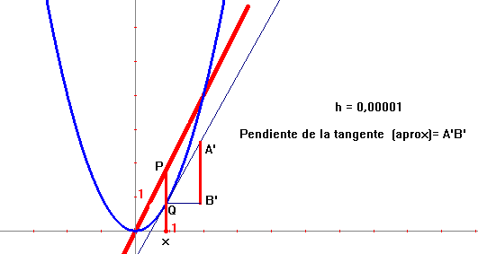 En la siguiente figura hacemos h = 000001, de tal manera que el segmento A'B' es "muy parecido" a la pendiente de la recta tangente, m = f '(x) y por lo tanto la gráfica en rojo será la gráfica de la función f '(x).