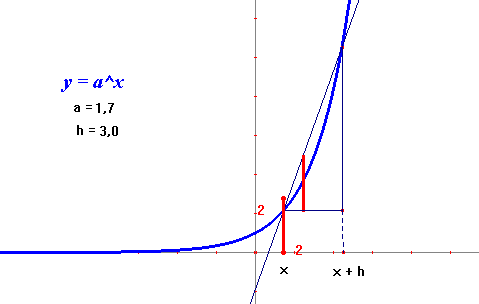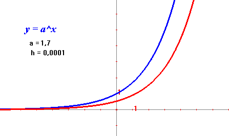 La gráfica de color rojo corresponde a la derivada de la función f(x) = ax , de tal manera que podemos tratar de determinar el parámetro a (la base de la exponencial) para el cual ambas gráficas coinciden.