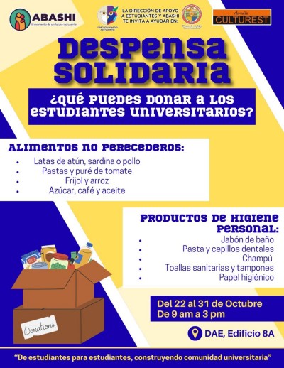 La Dirección de Apoyo a Estudiantes de la Universidad de Sonora y la asociación civil ABASHI invitan a la comunidad universitaria a apoyar en la campaña de donación de alimentos no perecederos y productos de higiene personal.