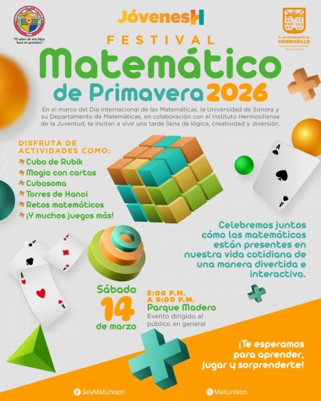 El Departamento de Matemáticas de la Universidad de Sonora y el Instituto Hermosillense para la Juventud invitan al público en general a asistir al Festival Matemático de Primavera 2026.
