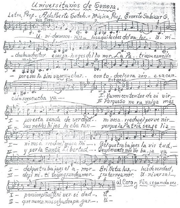 Para alguien que no sea de la Universidad de Sonora, es algo extraño y a veces incomodo ver que, efectivamente, en un gran número de eventos, como parte del protocolo se canta el himno universitario (con la participación activa de todos los presentes). Yo como soy muy desafinado, y nunca me he podido aprender la letra, prefiero los eventos donde no se canta el himno. La letra es un poco extraña, muy característica de aquellos años cuarenta (como los aguiluchos del valor o las falanges del honor) y otras con un lenguaje digno de ...el acero aprestad y el bridón.. Si quieres leer la letra completa del himno e inclusive oirlo, puedes consultar esta página oficial de la Universidad de Sonora
